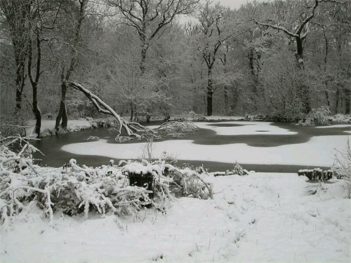 The Green Pond in winter 1974. The fallen and by now sinking tree trunk in the foreground was a vantage point for our fishing in the fifties. Del Smith